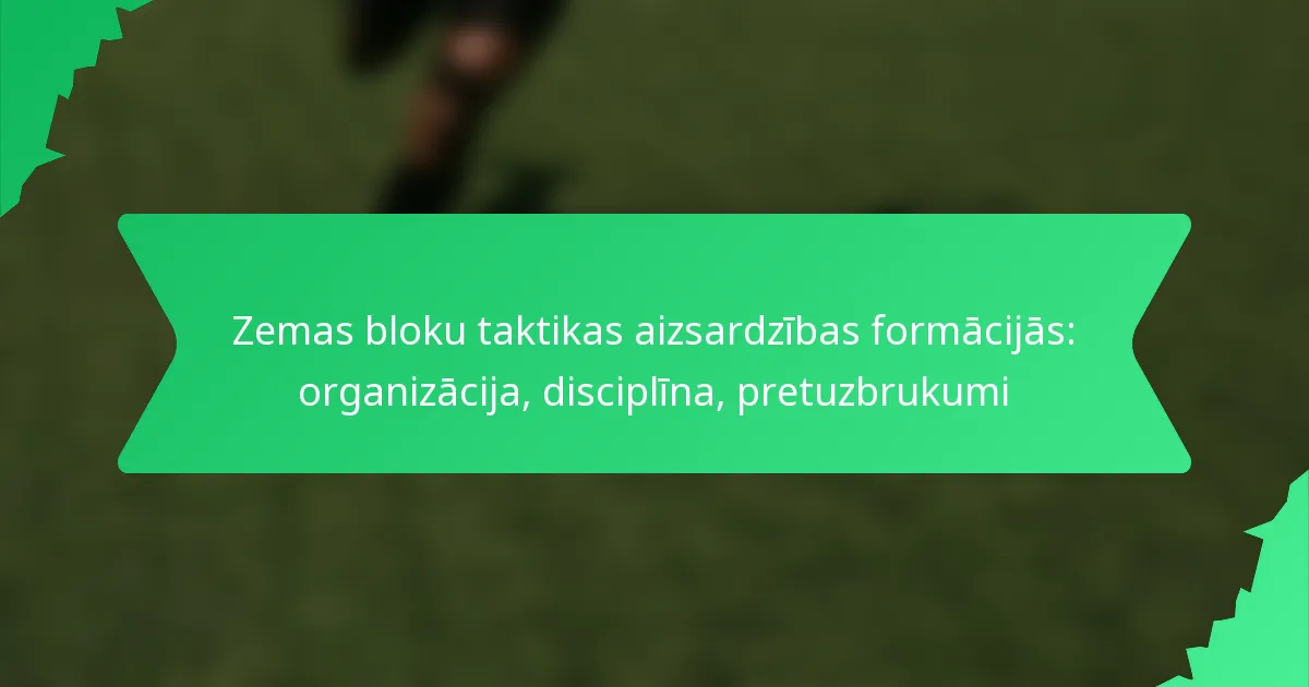 Zemas bloka taktika aizsardzības formācijās ietver spēlētāju novietošanu dziļi savā pusē, lai ierobežotu pretinieka uzbrukuma iespējas. Šī stratēģija balstās uz spēcīgu organizāciju un disciplīnu, ļaujot komandām absorbēt spiedienu, vienlaikus saglabājot gatavību izmantot pretuzbrukuma iespējas. Uzturot kompaktnību un skaidras lomas, komandas var efektīvi aizsargāties pret draudiem un ātri pāriet uz uzbrukuma spēlēm, kad rodas iespēja.